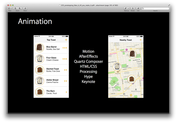 Most people know Apple’s Keynote as the PowerPoint equivalent on Mac OS X — presentation software. That is true, but it can also be used to produce surprisingly high-fidelity animations and prototypes. In fact, many employees at companies such as Google and Apple use Keynote on a daily basis for UI design, animation and prototyping.